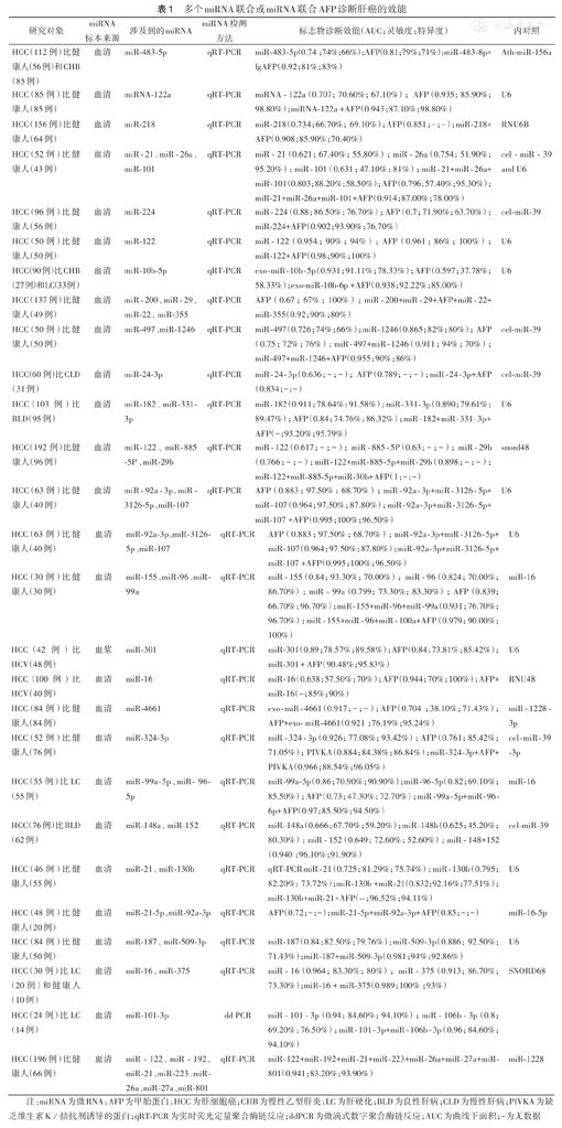 注:miRNA为微RNA;AFP为甲胎蛋白;HCC为肝细胞癌;CHB为慢性乙型肝炎;LC为肝硬化;BLD为良性肝病;CLD为慢性肝病;PIVKA为缺乏维生素K/拮抗剂诱导的蛋白;qRT-PCR为实时荧光定量聚合酶链反应;ddPCR为微滴式数字聚合酶链反应;AUC为曲线下面积;-为无数据
