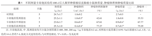 实验期间,各组小鼠生存状态良好,外观及采食、饮水正常,卡培他滨高剂量组1只小鼠死亡,解剖未见异常,可能与药物引起的不良反应有关。给药期间,4组小鼠体质量变化趋势一致(图2A),但卡培他滨剂量越高,肿瘤体积增大的速度越慢(图2B)。至处死小鼠时,4组小鼠体质量差异无统计学意义(P>0.05);卡培他滨中、高剂量组肿瘤体积和肿瘤质量均较对照组低(均P<0.05),且剂量越高,降低越明显;随剂量增高,肿瘤体积抑制率和抑瘤率均升高(表1)。