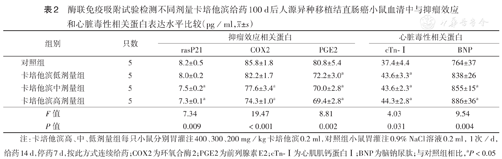 ELISA检测结果显示,卡培他滨中、高剂量组小鼠血清抑瘤效应指标rasP21、COX2、PGE2蛋白水平均较对照组低(均P<0.05),心脏毒性指标cTn-Ⅰ、BNP蛋白水平均较对照组高(均P<0.05)(表2)。