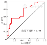 淋巴结转移组和无淋巴结转移组ADC、MD差异均无统计学意义,因此只绘制MK诊断直肠癌淋巴结转移的ROC曲线。ROC曲线分析结果显示,AUC为0.735,灵敏度和特异度分别为55.56%和88.37%,提示MK对直肠癌淋巴结转移有一定诊断价值(图2)。