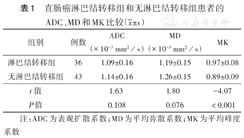 直肠癌淋巴结转移组和无淋巴结转移组患者的ADC、MD和MK比较(