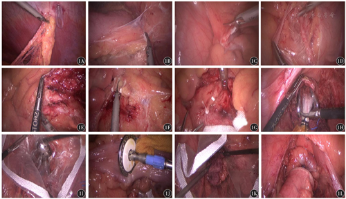 脐上方打孔腔镜探查腹腔未见明显积液及腹膜种植结节,见肠管与腹壁前次Torcar孔及侧腹壁轻微粘连(图1A、1B)。于原手术切口行常规5孔法入路,见肿瘤位于原吻合口附近,约1.5 cm×2.0 cm,肠管表面可见浆膜反应(图1C),距离肛缘约14 cm。用超声刀于右侧髂外动脉切开腹膜,显露右侧输尿管,沿右侧输尿管向下拓展间隙并游离直肠系膜(图1D),向上沿髂外动脉、髂总动脉、腹主动脉为导向拓展腹主动脉前间隙清扫腹主动脉前方淋巴结(图1E),游离并结扎肠系膜下动静脉(图1F、1G)。向下游离进入骶前间隙,同时向左右游离直肠两侧壁及前壁,裸化直肠肠管至肿瘤下缘4 cm。游离乙状结肠系膜并裸化乙状结肠至肿瘤上缘10 cm处,用直线切割闭合器自肿瘤远端离断直肠。