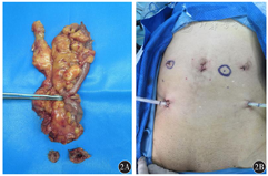 将切口保护套经主操作孔置入腹腔,用超声刀将直肠闭合端切开,经肛门置入卵圆钳,将保护套拉出肛门外(图1H),将抵钉座经保护套送入腹腔内(图1I),用超声刀切开乙状结肠预闭合端近端2 cm置入抵钉座(图1J),直线切割闭合器切除肿瘤标本,经肛门直肠残端开口处取出(图1K)。直线切割闭合器再次闭合直肠残端,经肛门置入环形吻合器,行乙状结肠直肠端端吻合(图1L)。术后标本及腹壁情况见图2。