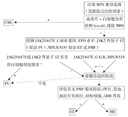 CML:慢性髓系白血病;EPO:促红细胞生成素;MDS:骨髓增生异常综合征;LDH:乳酸脱氢酶;PV:真性红细胞增多症;ET:原发性血小板增多症;PMF:原发性骨髓纤维化;a红细胞比容>0.56(女)或0.60(男)、红细胞容积升高或无继发性因素的条件下EPO含量低、JAK2外显子12或14阳性,同时红细胞比容>正常范围2.5倍标准差