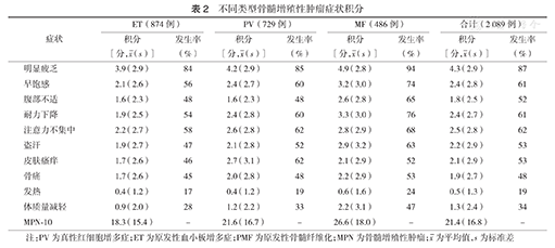 不同类型骨髓增殖性肿瘤症状积分