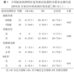 不同临床病理特征复发难治侵袭性非霍奇金淋巴瘤EPOCH方案治疗的客观疗效比较[例(%)]
