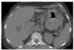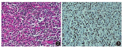 患者 女性,61岁,因上腹部不适7个月加重伴反复呕血、黑便2 d,于2014年10月16日来我院就诊,发病过程中无发热。查体:贫血貌,皮肤黏膜苍白,浅表淋巴结未触及肿大,腹平坦,未见肠型及蠕动波。血细胞分析(全血分类):红细胞计数3.38×1012/L、血红蛋白89.00 g/L、白细胞计数6.08×109/L、淋巴细胞计数1.03×109/L、淋巴细胞比率16.92 %。肝功能检查示:丙氨酸氨基转移酶4.40 U/L、天门冬氨酸氨基转移酶10.90 U/L、总蛋白64.40 g/L、清蛋白(A) 34.40 g/L、球蛋白(G)30.00 g/L、A/G 1.15、β2-微球蛋白(β2-MG) 4.59 mg/L。免疫球蛋白及骨髓穿刺未见异常。胃镜示:胃体下部至胃窦近幽门口见有结节状肿物,边界不清,胃窦腔狭窄、僵硬,肿物表面溃疡糜烂,见有红黑色血迹,散在溃疡,覆有灰白苔,组织硬,脆,易出血。CT检查结果示:胃体处胃壁明显增厚改变,胃腔狭窄;周围可见淋巴结影,脾脏增大,密度均匀(图1)。无传染病史,行下部胃大部+网膜切除术。病理检查结果:胃大弯长24.5 cm,小弯长6.0 cm,上切缘直径6.0 cm,下切缘直径2.0 cm,胃体大弯侧见肿物10 cm×7 cm×6 cm,肿物向胃腔内结节状生长,周边呈溃疡状,切面灰白,质嫩,浸润胃壁肌层,大网膜组织与胃浆膜层广泛粘连,胃周脂肪组织见肿大淋巴结9枚,直径0.2~ 2.0 cm。显微镜下观察:大淋巴细胞样相似于免疫母细胞的瘤细胞弥漫浸润,分布于胃壁,最深达深肌层,组织伴大面积坏死。细胞形态单一,胞质丰富,细胞核大而圆,染色质粗,核仁小,有的不明显,见浆样分化的细胞,核分裂象易见,可见凋亡小体及吞噬可染小体的巨噬细胞(图2)。免疫组织化学示:MUM-1+(图3)、CD20-、CD3-、bcl-2-、CD8-、CD30-、CD38-、CD138-、CD10-、bcl-6-、CK-、Ki-67 60 %+、CD21-。原位杂交EBER结果阳性。病理诊断结果:胃体大弯非霍奇金浆母细胞淋巴瘤(PBL),胃周淋巴结转移(2/9)。