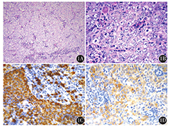 1A:肿瘤细胞呈片状或窦内生长 HE ×100;1B:肿瘤细胞核大,圆形,可见多个核仁HE ×400; 1C:肿瘤细胞"细胞质"CD20阳性EnVision × 400; 1D:肿瘤"细胞质"和高尔基区CD30阳性EnVision ×400