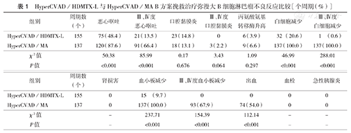 HyperCVAD/HDMTX-L与HyperCVAD/MA B方案挽救治疗弥漫大B细胞淋巴瘤不良反应比较[个周期(%)]