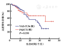 Sonneveld等[8]比较了PAD、VAD方案诱导治疗初发MM、后续行ASCT巩固及分别予硼替佐米或沙利度胺维持治疗的效果,PAD组CR率、CR+nCR率均高于VAD组(分别为36%比24%、49%比34%),中位PFS时间长于VAD组(分别为35、28个月),但两组5年OS率差异无统计学意义(分别为61%、55%)。目前PAD可替代VAD作为初发MM的一线治疗方案,但是许多经济困难的初发MM患者难以负担硼替佐米的高昂费用,因此,有必要探索适合我国国情、有效及价廉的其他治疗方案。VAD样-T方案含新药且费用相对较低,比较适合我国初发MM患者中经济条件差者。所以我们对PAD和VAD样-T方案进行了比较,结果显示PAD组CR率高于VAD样-T组,差异有统计学意义(P<0.05),而VGPR率及ORR两组相比差异均无统计学意义(均P>0.05)。虽然PAD组PFS率、5年OS率高于VAD样-T组,但差异均无统计学意义(均P>0.05)。