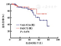 PAD组CR率高于VAD样-T组[31.5%(23/72)比9.3%(5/54)],差异有统计学意义(χ2=0.30,P=0.002)。PAD组和VAD样-T组的VGPR率及ORR分别为16.7%(12/72)比16.6%(9/54)及82.2%(65/72)比81.5%(44/54),两组差异均无统计学意义(P=0.180,P=0.190)。PAD组3年PFS率为49.9%,VAD样-T组为29.3%,两组差异无统计学意义(χ2=2.69,P=0.350)(图1)。PAD组中位PFS时间长于VAD样-T组[(38.2±2.2)个月比(28.0±7.6)个月],两组差异有统计学意义(χ2=5.71,P=0.017)。PAD组5年OS率为71.3%,VAD样-T组为53.6%,两组差异无统计学意义(χ2=2.37,P=0.474)(图2)。PAD组中位OS时间没有达到,VAD样-T组中位OS时间为49个月。