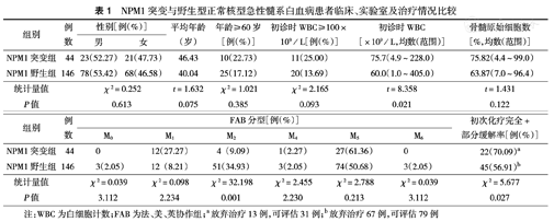 NPM1突变与野生型正常核型急性髓系白血病患者临床、实验室及治疗情况比较