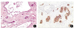 患者以头晕为首发症状,伴随排尿费力,体检有前列腺肥大,病理活组织检查发现前列腺间质小血管内见成簇异形淋巴样细胞。免疫组织化学示肿瘤细胞CD20+、LCA+、CD79a+、PAX5+、Ki-67阳性率90%,血管内皮CD34+。病理学诊断:前列腺的IVLBCL(活化B细胞起源)。患者拒绝治疗,于诊断后5个月死亡。