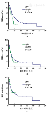 1A:总生存(OS)曲线;1B:无事件生存(EFS)曲线;1C:无复发生存(RFS)曲线;老年为≥60岁;非老年为<60岁