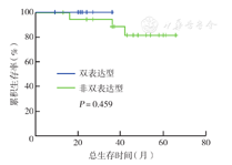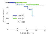 43例患者中位随访40个月(9~62个月)。截至最终随访时间,37例(86.0 %)生存,其中24例DLBCL,4例MCL,10例滤泡型淋巴瘤;1、3年总生存率分别为97.6 %、92.8 %。27例DLBCL患者中位随访37个月(9~62个月),1、3、5年总生存率分别为100.0 %、94.4 %、85.7 %。双表达型DLBCL患者中位随访22个月(9~36个月),1年总生存率为100.0 %,仍需长期随访。采用Kaplan-Meier法分析显示,年龄≤60岁患者总生存优于>60岁患者,差异有统计学意义(P=0.049)(图1),IPI评分低危+低中危(0~2分)患者总生存率高于中高危+高危(0~5分)患者,但差异无统计学意义(P=0.551)(图2),DLBCL双表达型与非双表达型患者总生存率差异无统计学意义(P=0.459)(图3)。
