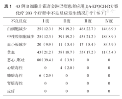 采用DA-EPOCH-R方案治疗43例B细胞NHL患者,观察近期疗效、不良反应,进行随访,分析生存情况。