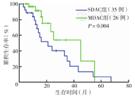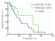 MDAC组与SDAC组的RFS时间分别为42.7和16.0个月(P=0.002)(图1),OS时间为44.6和18.2个月(P=0.004)(图2),累积复发率分别为23.1%(7/26)和8.6%(19/35)(χ2=4.567,P=0.033),3年生存率分别为26.9%(6/26)和54.3%(3/35)(χ2=2.496,P=0.114)(图1、图2)。