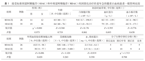 接受标准剂量阿糖胞苷(SDAC)和中剂量阿糖胞苷(MDAC)巩固强化治疗的老年急性髓系白血病患者一般资料比较