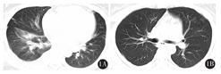 患者 女性,47岁,主因齿龈渗血2周于2013年9月11日入我院。入院后血常规示:白细胞计数5×109/L,血红蛋白60 g/L,血小板计数20×109/L;凝血酶原时间14.80 s,活化部分凝血活酶时间29.0 s,纤维蛋白原含量1.5 g/L,D二聚体6.64 mg/L;经骨髓检查,伴t(15;17),(q22;q21),PML-RARα阳性,明确诊断为急性早幼粒细胞白血病(APL)。入院查体:齿龈、皮肤有出血表现,胸骨压痛阳性,右下肺叩诊实音,右肺底呼吸音消失,考虑患者合并肺部感染。入院后立即给予维甲酸20 mg/次,每天2次诱导分化治疗,同时输注新鲜冷冻血浆、纤维蛋白原、冷沉淀纠正出凝血紊乱,输注血小板,降低出血风险,每日输注血液制品前给予地塞米松2 mg,同时给予哌拉西林钠抗感染治疗,积极完善肺部CT等相关检查。患者接受诱导分化治疗5 d后,出现刺激性干咳,伴轻度胸闷、气短。查体右肺底呼吸音消失,右肺可闻及少量湿啰音。肺部CT示:右肺下叶炎症,右侧胸腔积液(图1A)。在诱导分化治疗同时给予醋酸卡泊芬净防治真菌感染,注射用亚胺培南西司他丁钠(商品名:泰能)抗细菌治疗,并完善G试验、GM试验、T-SPOT及抗结核抗体等相关检查,结果均未见异常。患者分别于9月19日及24日出现夜间突发心悸、气短,端坐呼吸,坐卧不宁。静脉给予地塞米松10 mg后不适症状消失。期间2次复查CT均提示肺部炎症较前加重。患者经广谱强力抗感染治疗10 d,肺部症状及影像学改变进行性加重,GM试验阴性,故不支持真菌感染。经呼吸科会诊考虑感染证据不足,怀疑白血病浸润,建议通过支气管镜等相关检查明确肺部情况。但考虑肺部诊断基本明确以及出血风险,未做支气管镜检查。遂调整治疗方案,停用抗感染治疗,按分化综合征治疗,地塞米松每天6~10 mg,患者心悸、气短、面部肿胀、肺部啰音等逐渐消失,精神状况改善。10 d后复查肺部CT恢复正常(图1B)。故明确诊断为:APL伴分化综合征。