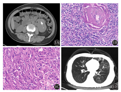 1A:腹部CT示腹膜后见低密度包块,边界清楚,其中见辐射状钙化影;1B:腹膜后肿物淋巴组织增生,其中见透明样变小血管 HE ×200;1C:腹膜后肿物滤泡间呈束状或席纹状分布的梭形细胞 HE ×200;1D:胸部CT示左肺见不均匀斑片状低密度影,呈马赛克样分布,并见支气管扩张