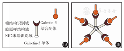 1A:Galectin-3单体及Galectin-3结合配体;1B:Galectin-3单体通过其NH2末端结构域相互作用形成五聚体,Galectin-3五聚体通过糖结构识别域与配体结合