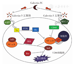 Galectin-3五聚体与αγβ3、MUC-1结合后通过不同信号途径激活NF-κB,发挥抑凋亡作用,而Galectin-3C可通过竞争性与配体结合,从而抑制Galectin-3的作用,且与Bor有协同作用