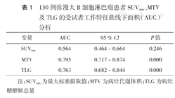 130例弥漫大B细胞淋巴瘤患者SUVmax、MTV及TLG的受试者工作特征曲线下面积(AUC)分析