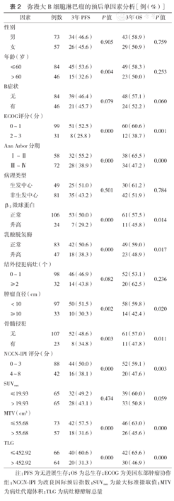 单因素分析结果显示:ECOG评分、Ann Arbor分期、β2-MG水平、LDH水平、肿瘤直径、骨髓侵犯、NCCN-IPI评分、MTV、TLG均是患者PFS率及OS率的影响因素(均P<0.05);年龄是患者PFS率的影响因素(P<0.05)。而SUVmax与患者的PFS及OS均无关(均P>0.05)(表2)。