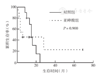 亚砷酸组与对照组的中位显效时间分别为8.00个月(6.00~9.00个月)和3.50个月(1.00~24.00个月),总有效分别为3例(3/10)和6例(6/11),两组总有效率差异无统计学意义(P=0.245);两组不良反应发生率差异无统计学意义(P>0.05)。亚砷酸组中位OS时间10.00个月(8.00~24.00个月),对照组为6.00个月(1.00~69.00个月),两组差异无统计学意义(P=0.900)。
