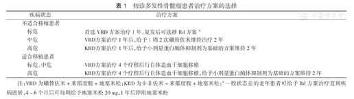 注:VRD为硼替佐米+来那度胺+地塞米松;KRD为卡非佐米+来那度胺+地塞米松;a一般状态差的老年患者可给予Rd方案治疗直到疾病进展,4~6个月后可每周给予地塞米松20 mg,1年后停用地塞米松