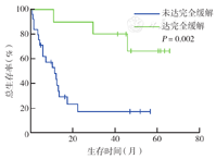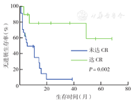 单因素分析显示,中高危、高危(IPI>2分)者中位PFS时间短于中低危、低危(IPI≤2分)者(5个月比15个月,χ2=4.047,P=0.044)(图2);诱导化疗未达CR者中位PFS时间短于达CR者(5个月比未达到,χ2=9.963,P=0.002)(图3);而患者年龄、病理类型、临床分期、B症状、1个以上结外部位受累、骨髓受累、美国东部肿瘤协作组(ECOG)评分及血清乳酸脱氢酶(LDH)水平升高不影响PFS。Cox多因素分析显示,仅诱导化疗是否达CR是PFS的独立影响因素(HR=6.118,95% CI 1.327~28.206,P=0.020)(表1)。
