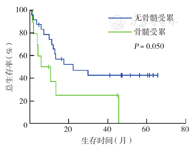 单因素分析显示,中高危、高危(IPI>2分)者中位OS时间短于中低危、低危(IPI≤2分)者(12个月比37个月,χ2=3.901,P=0.048)(图4);骨髓受累者中位OS时间短于骨髓未受累者(7个月比28个月,χ2=3.855,P=0.050)(图5);诱导化疗达CR者中位OS时间优于未达CR者(未达到比14个月,χ2=9.242,P=0.002)(图6)。Cox多因素分析显示,骨髓是否受累(HR=0.270,95% CI 0.101~0.722,P=0.009)和诱导化疗能否达CR(HR=6.669,95% CI 1.754~25.354,P=0.005)是OS的独立影响因素(表2)。