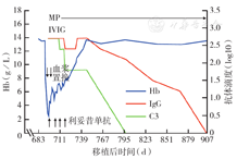 注:共输注24 U洗涤红细胞,末次输血时间为移植后第704天(AIHA发生后第12天),治疗包含静脉注射甲泼尼龙(MP)、人免疫球蛋白(IVIG)、血浆置换及利妥昔单抗,治疗后血红蛋白(Hb)水平持续升高并脱离输注