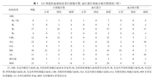 在121例血液病患者中,34例急性白血病患者WBC增高16例,Hb减少33例,Plt减少33例;16例MM患者WBC减少14例,Hb减少14例,Plt减少2例;21例MDS患者WBC减少14例,Hb减少20例,Plt减少17例;11例AA患者三系均显著减少(表1)。