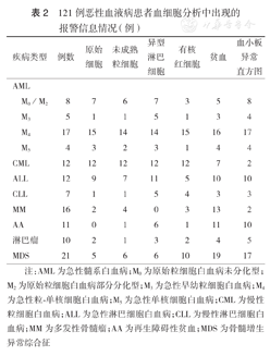 采用SYSMEX XE-2100血细胞分析仪的血细胞分类计数(DIFF)散点图和报警信息,对山西医科大学第二医院2016年10月至2017年2月收治的121例初发恶性血液病住院患者的血常规结果进行分析。