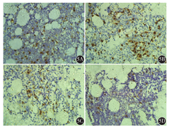 标本均经4%甲醛溶液固定,石蜡包埋,切片后参考EliVision法进行免疫组织化学染色,使用二氨基联苯胺(DAB)染色,苏木精-伊红(HE)对比染色,所有抗体均购自福州迈新生物技术开发有限公司。统计骨髓免疫病理纠正临床分期情况。