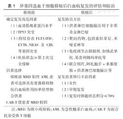 Patel等[4]发现急性髓系白血病(AML)患者allo-HSCT后早期(6~12个月)复发的高危因素包括高危细胞遗传学异常、移植时的疾病状态≥第2次完全缓解(CR)。此外,移植前TP53突变、持续存在ETV6和FLT3-ITD以及NRAS和CBL等基因突变也与白血病患者allo-HSCT后高复发率、低无病生存(DFS)率密切相关[5,7]。Schwarzbich等[6]发现移植前的血清低水平瘦素蛋白预示移植后AML患者的早期复发增高,这提示纠正患者移植前的营养状态可能成为降低移植后复发的新策略。