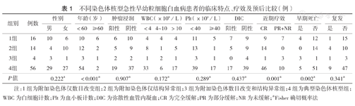附加仅数目改变组、附加仅结构异常组、附加数目改变和结构异常组以及典型染色体组患者的性别、肿瘤浸润、白细胞计数、血小板计数及DIC情况比较,差异均无统计学意义(均P>0.05)(表1)。