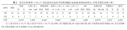 是否含有典型t(15;17)染色体改变急性早幼粒细胞白血病患者的临床特点、疗效及预后比较(例)