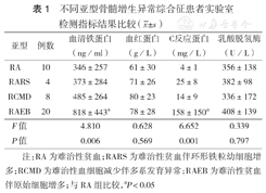 不同亚型骨髓增生异常综合征患者实验室检测指标结果比较(