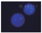 染色体核型:46,XY,del(1)(q41),?t(5;17)(q35;q21),del(7)(q32),der(7),add(9)(p24),+21,inc[cp18]/46,XY[2](图1)。双色RARα(3' RARα绿色/5' RARα红色)探针荧光原位杂交(FISH)阳性信号百分率为79.8%(图2),RARα和PML探针FISH阳性信号百分率为0.8%(阈值<2.1%)。43种白血病融合基因多重聚合酶链反应(PCR)示STAT5b-RARα阳性。确诊为APL,STAT5b-RARα阳性。患者回当地医院于2018年3月15日开始用全反式维甲酸(ATRA)(40 mg/d,口服)联合三氧化二砷(10 mg/d,静脉滴注)治疗。待中国医学科学院北京协和医院血液病医院相关检查回报后,于2018年3月29日开始加用柔红霉素(40 mg/d,静脉推注,连用3 d)治疗,患者于2018年4月3日死于脑出血。