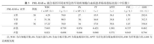 PML-RARα融合基因不同亚型急性早幼粒细胞白血病患者临床指标比较(中位数)