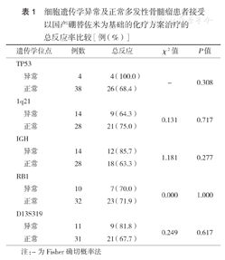 细胞遗传学异常及正常多发性骨髓瘤患者接受以国产硼替佐米为基础的化疗方案治疗的总反应率比较[例(%)]