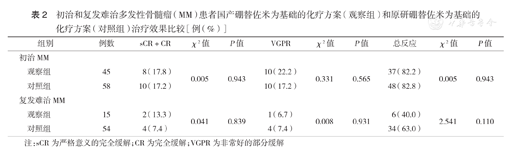 观察组与对照组初治MM和复发难治MM患者疗效分别比较,差异均无统计学意义(均P>0.05)(表2)。