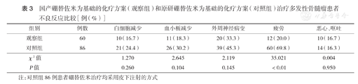 国产硼替佐米为基础的化疗方案(观察组)和原研硼替佐米为基础的化疗方案(对照组)治疗多发性骨髓瘤患者不良反应比较[例(%)]