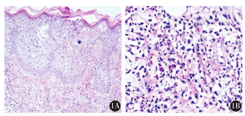 考虑该患者为维甲酸诱导后分化综合征不除外,维甲酸药物变态反应所致药疹亦不排除。诱导治疗后第19天,全面评价病情完全缓解(CR)。因不排除维甲酸可能是诱发因素,遂停用维甲酸,予亚砷酸单药继续诱导,并使用地塞米松10 mg 2次/d,每天2次。暂无法排除感染因素,遂继续使用万古霉素、美罗培南、伏立康唑、更昔洛韦治疗。使用地塞米松3 d后,患者症状和体征好转。同时骨髓象恢复,血象基本正常。背部皮肤病理活组织检查示:表皮内泡形成,浅层血管扩张充血,红细胞外溢(图1A);血管周围大量中性粒细胞浸润真皮,可见少量淋巴细胞(图1B)。皮肤科考虑诊断为Sweet综合征,加用抗变态反应药物,继续使用激素,减量抗生素。给予美罗培南单药抗感染。停用维甲酸,亚砷酸单药诱导。治疗4 d后患者皮疹消失,阴囊及阴茎的硬节亦消褪,再无发热。复查肺部CT示胸腔积液吸收。体质量恢复。地塞米松治疗7 d后,症状基本好转。激素3 d内减量一半,剩余激素按1 mg/kg泼尼松,维持1~2周。经减量后患者病情无复发。使用亚砷酸至诱导治疗28 d。休息1周后激素停药。再次行DA、MA、HA方案巩固治疗,病情持续CR,常规三联鞘内注射预防,后行维持治疗,常规维甲酸、6-MP、甲氨蝶呤、亚砷酸维持治疗。再次口服30 mg/d维甲酸,未出现皮疹等其他较严重并发症。至截稿前患者结束治疗3年,随访无复发。