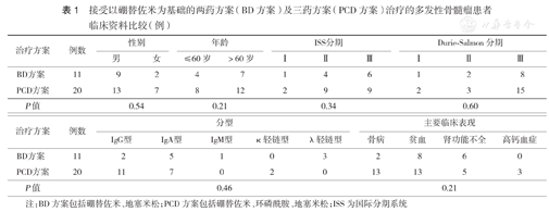 接受以硼替佐米为基础的两药方案(BD方案)及三药方案(PCD方案)治疗的多发性骨髓瘤患者临床资料比较(例)