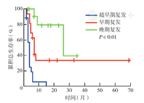 骨髓复发:骨髓中原始及幼稚淋巴细胞占有核细胞比例≥20%。中枢神经系统白血病复发为满足下列任意一条:(1)头颅影像学发现浸润或块状病变;(2)除外其他原因的颅神经麻痹或视网膜浸润;(3)脑脊液白细胞计数>5×106/L,有原始及幼稚淋巴细胞,并除外损伤所致。睾丸白血病复发:睾丸无痛性肿大,质地较硬,确诊依靠活组织检查。联合复发:有髓外复发且骨髓中原始及幼稚淋巴细胞比例>0.05。超早期复发:复发距初次缓解时间<18个月;晚期复发:复发距初次治疗停药时间>6个月;早期复发:不满足以上两种情况者。复发后总生存(OS)时间:从诊断复发开始至因任何原因死亡或随访截止的时间。