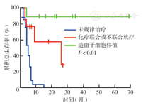 截至2019年5月1日,29例(61.70%)患儿死亡,18例(38.30%)生存,复发后中位随访5.5个月(1.0~69.0个月),复发后2年OS率为31%(图1)。初诊白细胞计数<50×109/L与≥50×109/L复发患儿复发后2年OS率分别为39%和13%(χ2=5.623,P=0.018)(图2);初诊标危、中危、高危患儿复发后2年OS率分别为72%、31%和8%(χ2=10.068,P=0.007)(图3);超早期复发、早期复发、晚期复发患儿复发后2年OS率分别为0、33%和79%(χ2=30.066,P<0.01)(图4);复发后单纯化疗联合或不联合放疗、移植及未规律治疗患儿复发后2年OS率分别为57%、89%和0(χ2=26.885,P<0.01)(图5)。初诊年龄、性别、免疫分型、泼尼松反应、诱导治疗第15天骨髓状态、第33天MRD、第3个月MRD及复发部位对OS时间均无影响(均P>0.05)。9例患儿获得CR2后外院行异基因造血干细胞移植,中位移植时间为4.5个月(3.0~7.0个月),中位随访时间为22个月(4~69个月),1例移植后4个月死于巨细胞病毒肺炎,余8例至截稿前均生存。