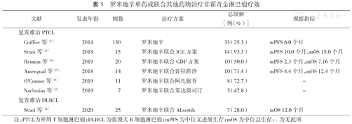 | Coiffier等[12] | 2014 | 130 | 罗米地辛 | 33(25.3) | mPFS 6.0个月 | |
